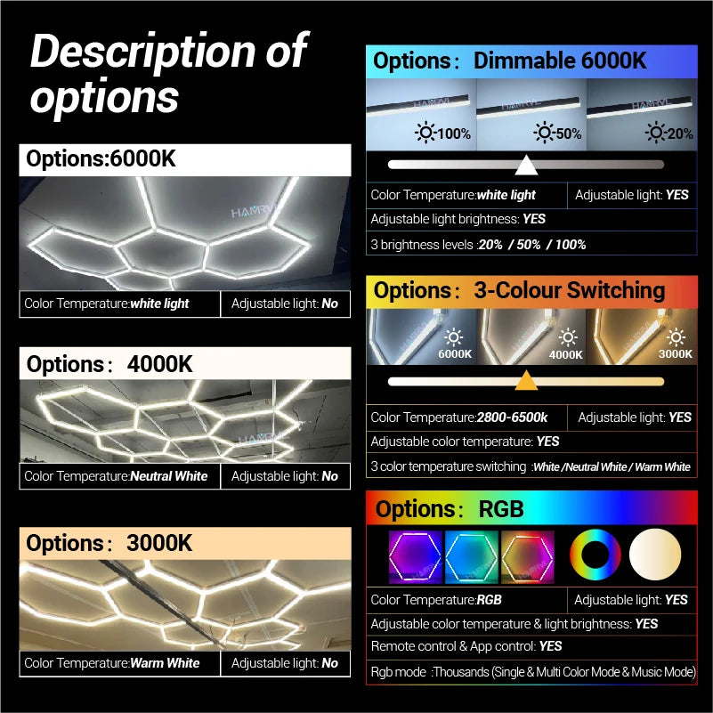 Elevate your garage lighting with the HAMRVL hexagonal LED fixture—compact geometry, steady brightness, and flexible color options.