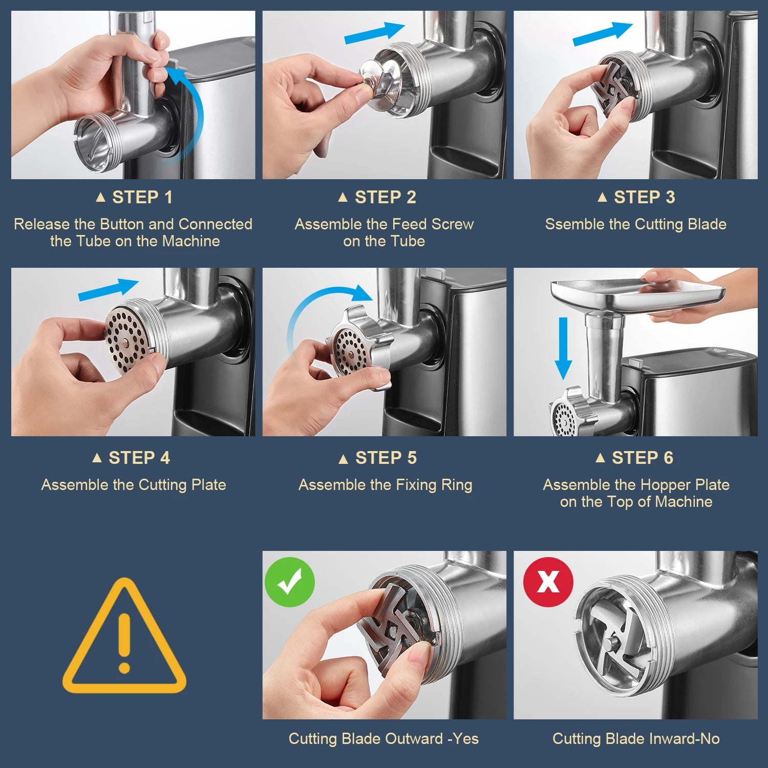 Easy cleaningThe meat grinder is easy to clean, accessories can be removed, please clean all parts with warm water. Note: Do not be washed in the dishwasher. |