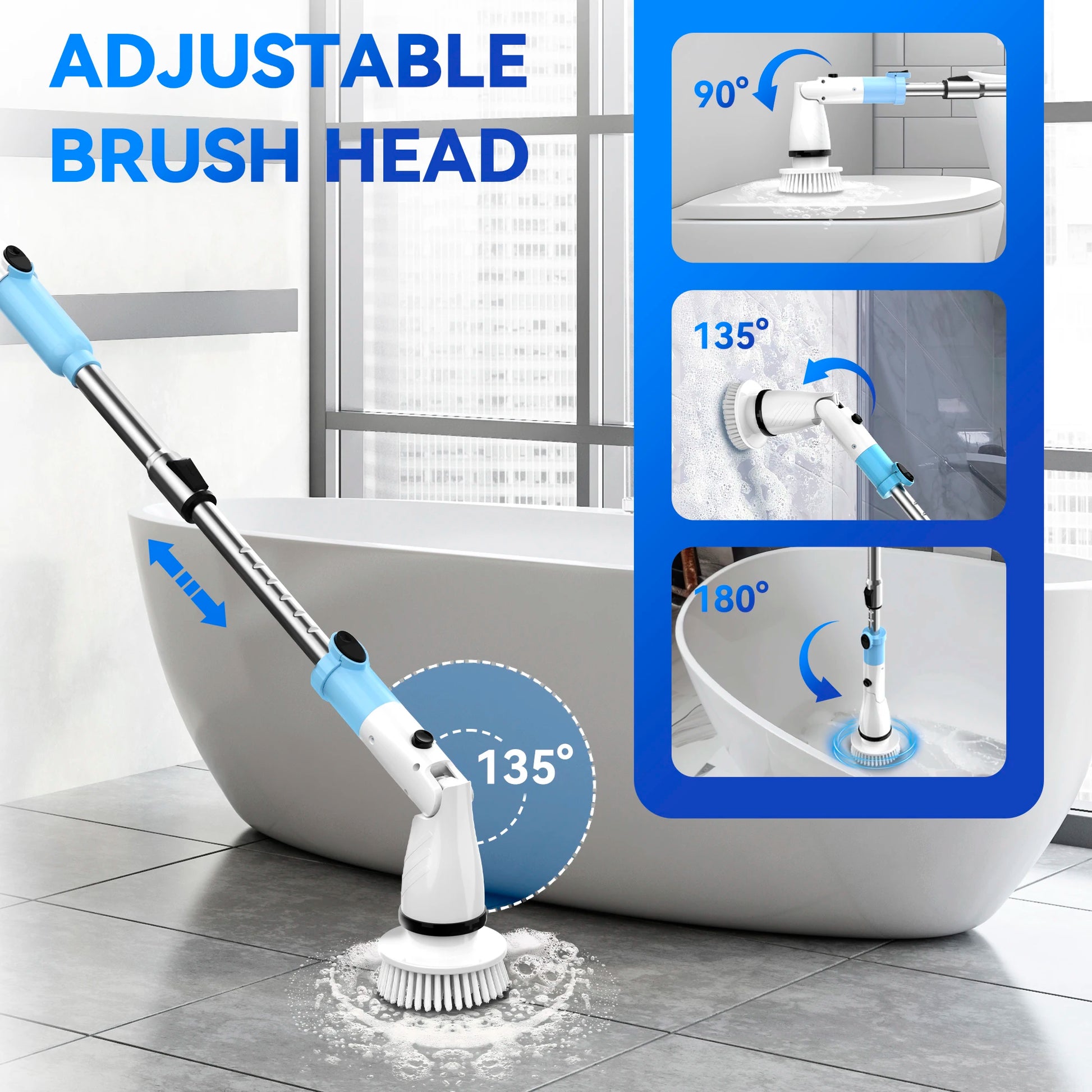 【Adjustable Brush Heads】Electric spin cleaning brush head angle is adjustable and flexible, No need to bend over or change positions while cleaning, and this electric spin scrubber can adapt to all kinds of hard-to-reach places, such as shower head, sink or faucet gap and so on.